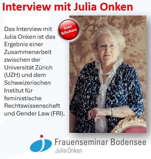In den 1980er-Jahren gründete sie das Frauenseminar Bodensee, das zu einem zentralen Ort feministischer Bildungsarbeit wurde. Dort verband sie persönliche Entwicklung, psychologisches Wissen und gesellschaftskritische Analyse. Im Zentrum ihrer Arbeit standen Selbstwert, Selbstwirksamkeit, Sprache und die Frage, warum Frauen trotz hoher Kompetenz so selten öffentlich auftreten und gehört werden. Mit ihren Seminaren, Ausbildungen und Publikationen leistete Julia Onken einen wichtigen Beitrag zur Sichtbarmachung jener subtilen Mechanismen, durch die Frauen bis heute entwertet und begrenzt werden.